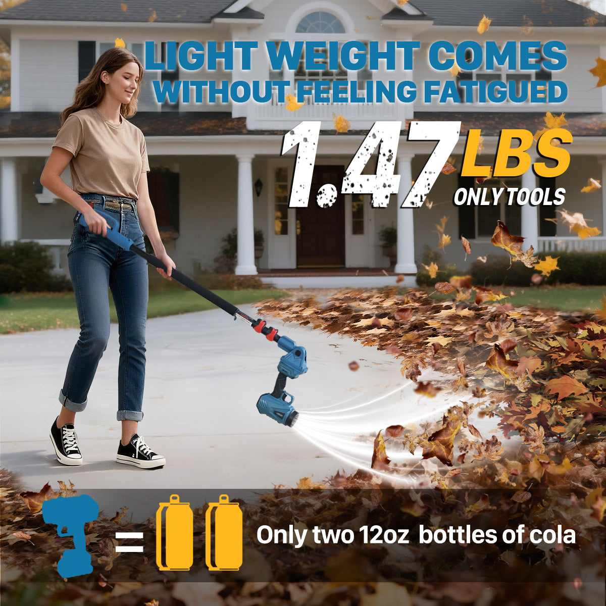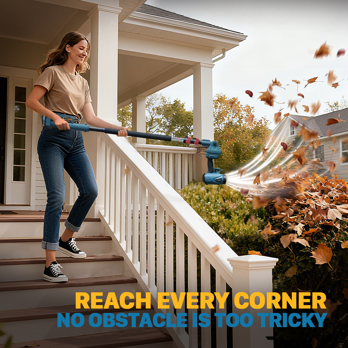 【Versatile Design】This telescoping leaf blower cordless comes with one extension tube, one flat nozzle, and one round concentrator nozzle, making it adaptable to a variety of cleaning scenarios. It effectively clears debris both on the ground and at height, making it ideal for use in porches, indoors, tight corners, garage floors, and workbenches.