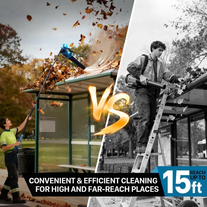 JOVANT 2-in-1 High-Power Telescopic Pole Cordless Leaf Blower — Extends up to 15.3 ft, delivers 670 CFM airflow. Includes 20V MAX 2 × 6.0Ah batteries and charger. Ideal for clearing roof leaves, cleaning bus shelter tops, and maintaining solar panels.