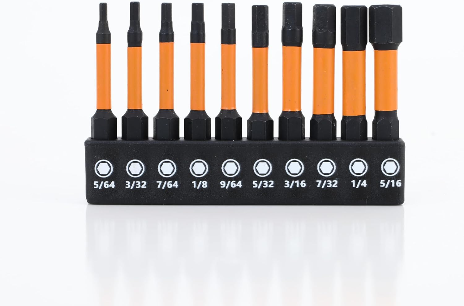 【Includes】This set comes with H5/64, H3/32, H7/64, H1/8, H9/64, H5/32, H3/16, H7/32, H1/4, H5/16 totally 10 pcs hex bit. Customer service is available if you have any questions about our products.