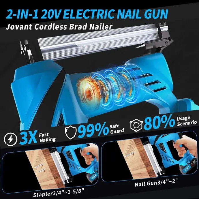 Akku-Nagler 2-in-1, 20 V, 4 x 80 Nägel, 4 x 88 Klammern, Klammerentferner, 2 x 2,0 Ah Li-Ion-Akkus und 2,4 A Ladegerät, ideal für Heimwerkerprojekte.