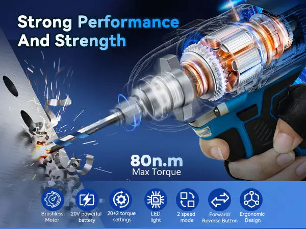 Mit zwei variablen Drehzahlstufen (0–450 U/min und 0–1500 U/min) bietet dieser Akku-Bohrschrauber präzise Kontrolle für verschiedene Bohraufgaben. Die Drehmomenteinstellungen, darunter 20+2 Optionen, ermöglichen optimale Leistung und Genauigkeit und eignen sich daher für kleinere und größere Bohrer sowie Bits.