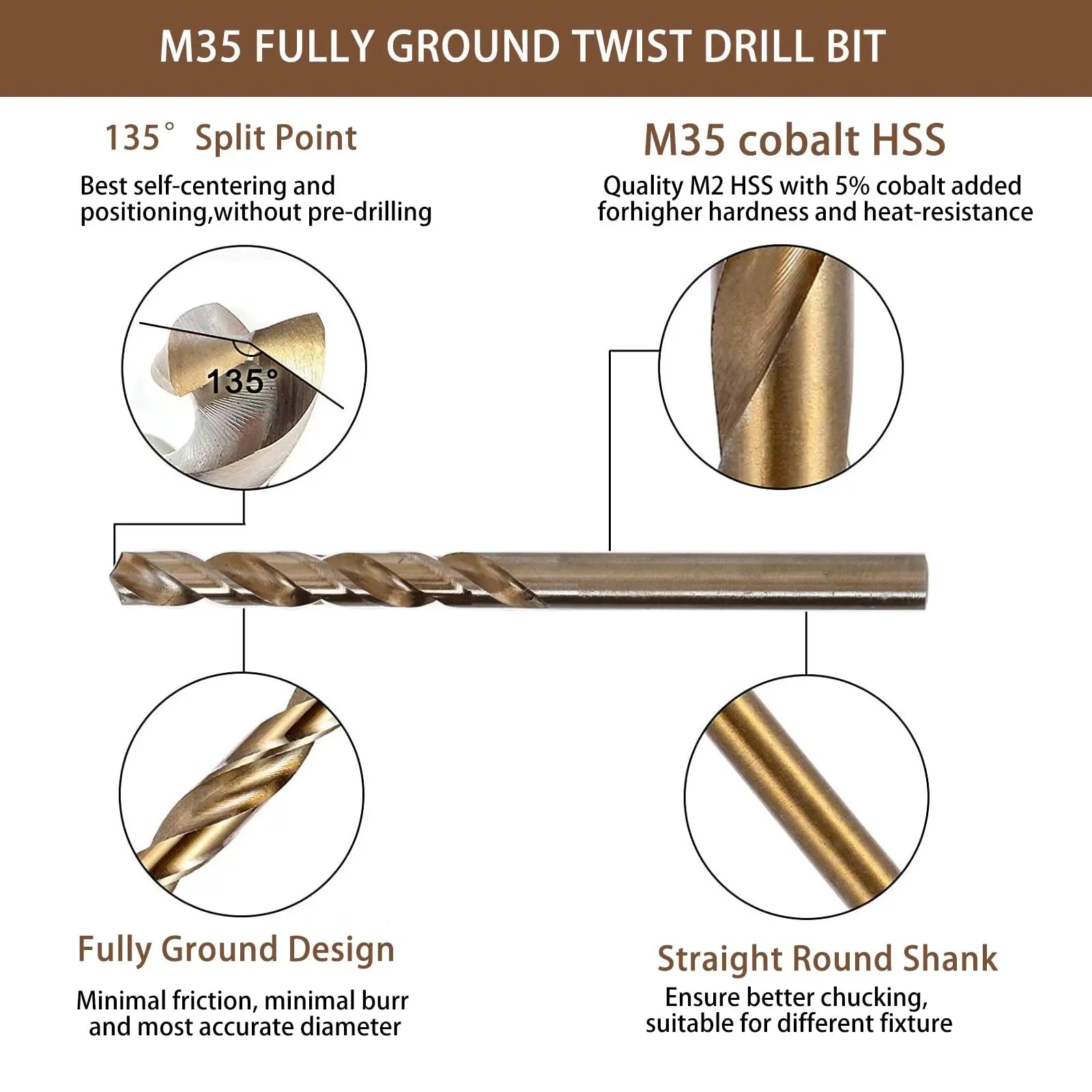 10pcs 1/4 Inch(9.5mm) Cobalt Drill Bits, M35- HSS High Speed Steel for Drill/Driver Stainless Steel Heavy Duty Twist Steel Drill Bits
