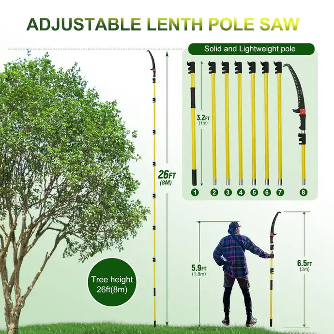 ➤【Facile à utiliser】 : avec une scie télescopique pour tailler et élaguer, vous pouvez ajuster le poteau à la hauteur souhaitée sans vous soucier de tomber d'un endroit élevé. Peut être utilisé pour couper des branches d'arbres tels que les palmiers et les cerisiers. Mais d'autres bois comme le bouleau, le hêtre ou les arbres d'ornement comme les conifères peuvent également être merveilleusement coupés.
