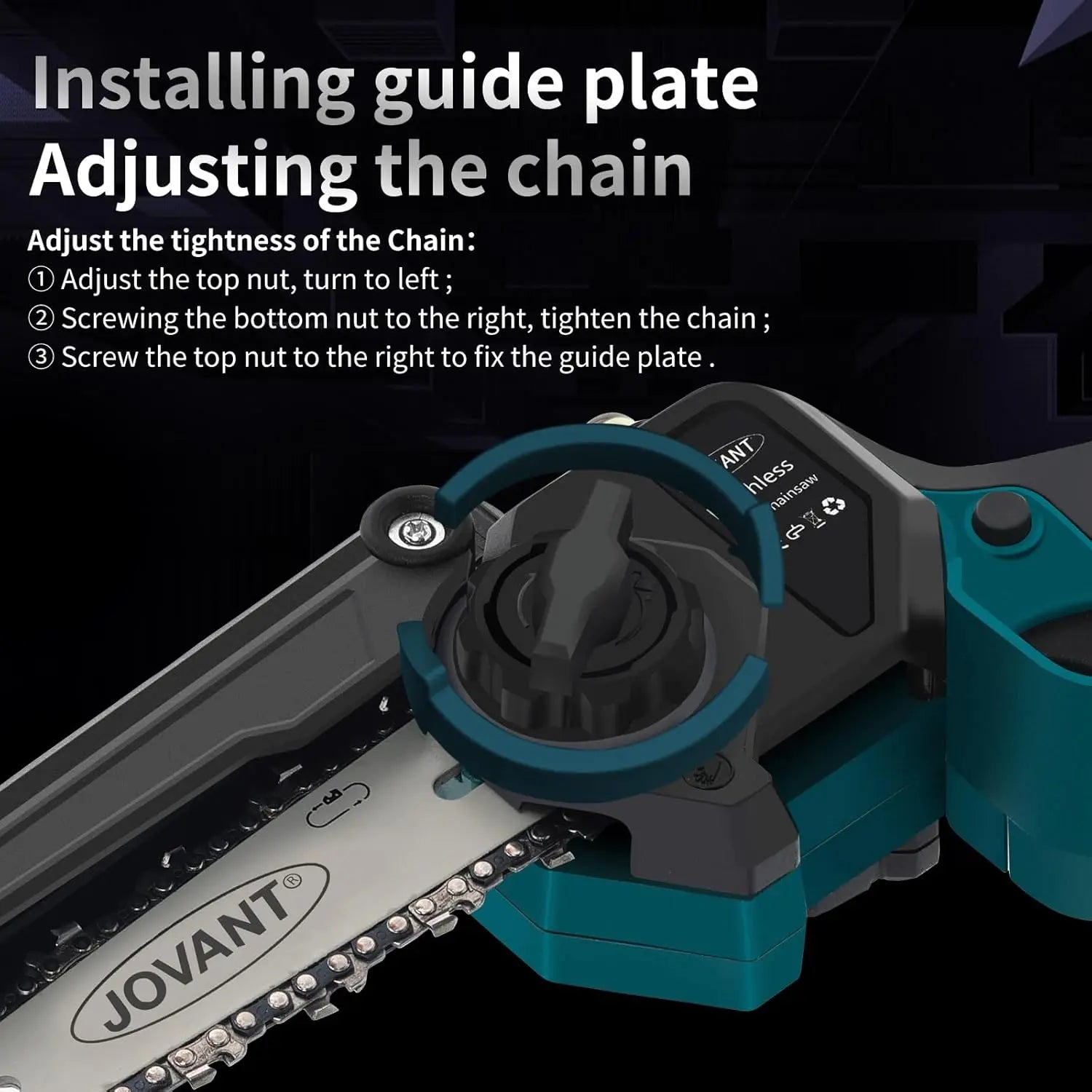 ▶ 【 FACILE À REMPLACER 】 : Retirez la chaîne d'origine, remplacez la chaîne d'origine par l'une des chaînes de tronçonneuse JOVANT (Veuillez noter que la chaîne est dans la bonne direction des dents de coupe, la longue lame tranchante pointe vers l'avant)