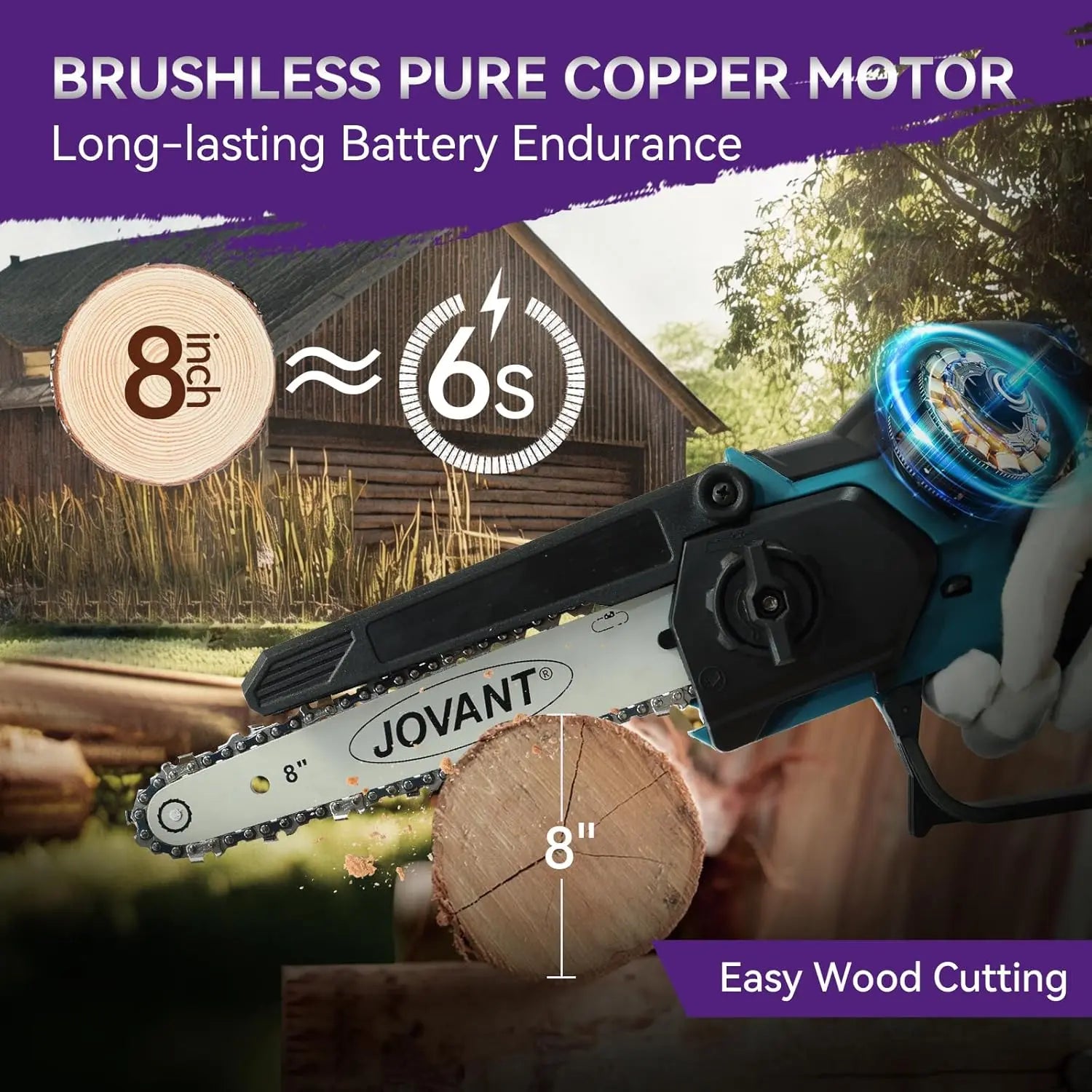 - Efficient Cutting - The Jovant 6 mini chain saw delivers exceptional cutting power with a 21.8 ft/s chain speed, effortlessly slicing through 6-inch logs in just 8 seconds.The small saw 36-tooth precision chain and intelligent torque adjustment system ensure smooth operation for pruning and wood cutting tasks. This cordless electric chainsaw combines professional-grade performance with the convenience of battery-powered operation.