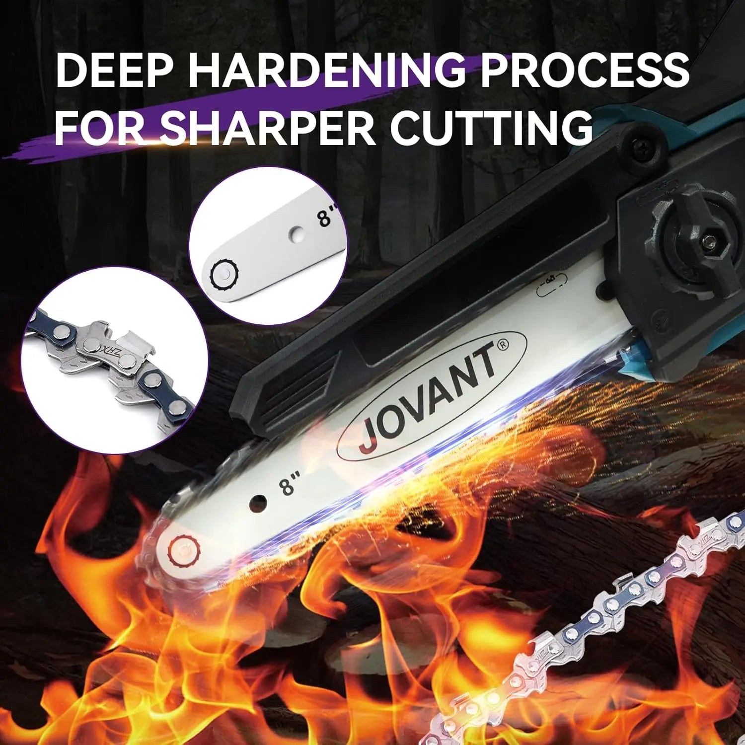 JOVANT 8-inch guide is made of titanium alloy,durable and long service life.JOVANT chain 8-inch chain,each accessory adopts titanium alloy chain,which has good performance and is not easy to stretch,and the chain realizes low rebound and low vibration under the premise of guaranteeing the quality,which improves the safety of use.