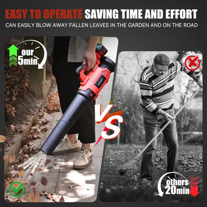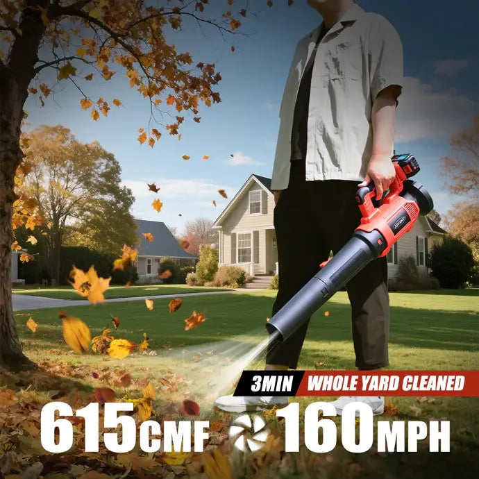 【High-Efficiency Power】The JOVANT Leaf Blower cordless utilizes advanced turbo technology and a brushless motor design to maximize leaf clearing performance. It delivers an impressive airflow of up to 615 CFM/160 MPH, ensuring that this cordless leaf blower can effortlessly clear large volumes of leaves and debris. Enhance cleaning efficiency and save valuable time with its powerful performance.