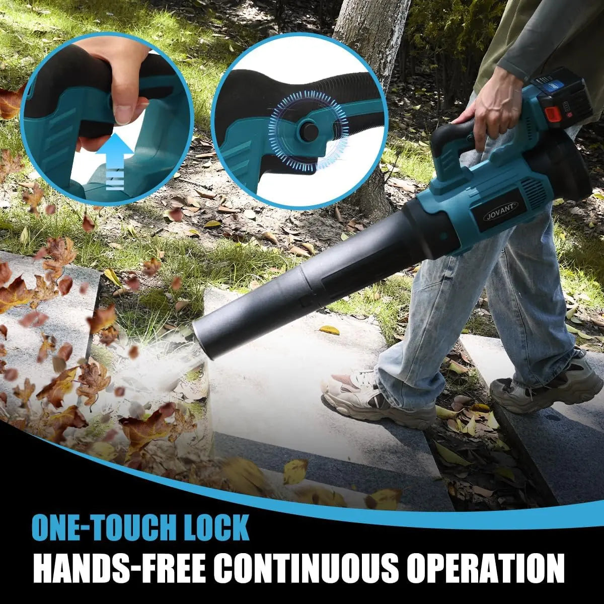 【ONE-TOUCH LOCK】The JOVANT cordless leaf blower features a ONE-TOUCH LOCK function. With a simple press of the button, the switch locks into place, eliminating the need to continuously press the trigger. This significantly reduces hand fatigue during prolonged operation, making it ideal for large-area tasks.