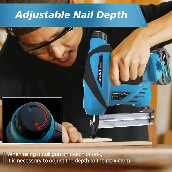 - 【Tool-Free Depth Adjustment】Nail gun battery powered adopts spiral-drive technology. Different decoration scenes apply tool-less depth adjustable function. Adjust the knob in the direction of+" the impact will be more and more strong