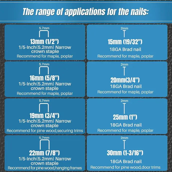 - 【2-in-1 Nail gun/Staple gun】It drives 1/5'' crown staple from 1/2'' to 7/8'', and brad nail from 5/8'' to 1-1/4'', which makes the electric nail gun ideal for fastening lightweight decoration trim, simple projects like floorboards. It's easy to use, powerful and maintain.