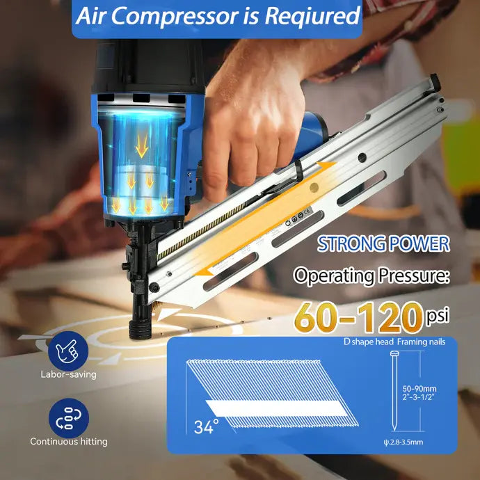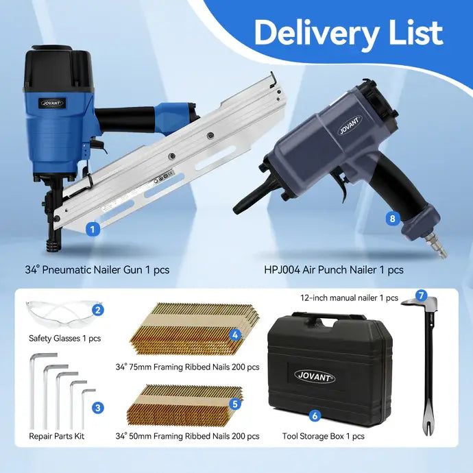 - Protection System,Ensuring Tool Durability:This framing nailer gun is equipped with a built-in jam release lever,which can quickly reset the drive blade in case of jamming,thus avoiding damage;the contact trips,and the tool can only be operated when the safety device is in the correct position,thereby avoiding injury.