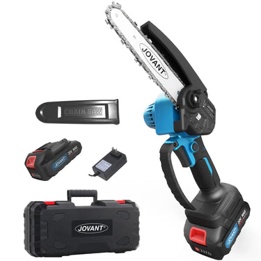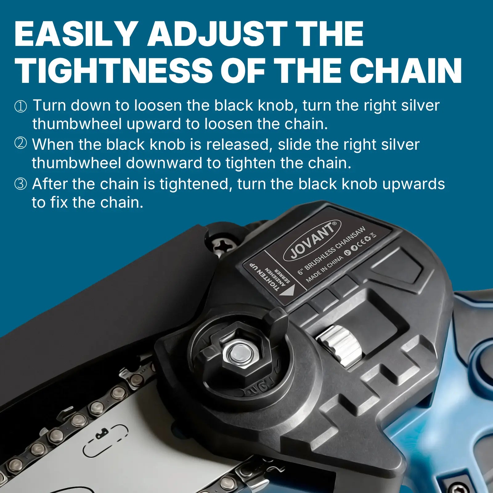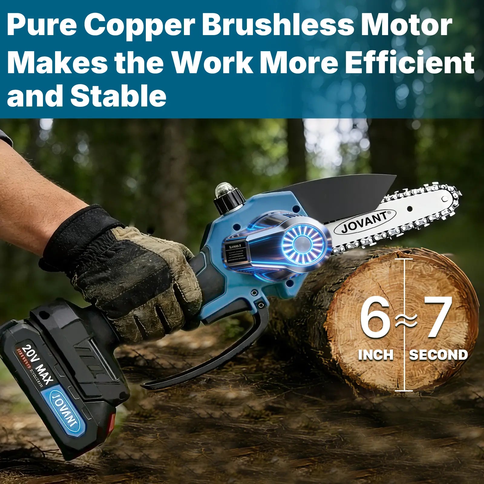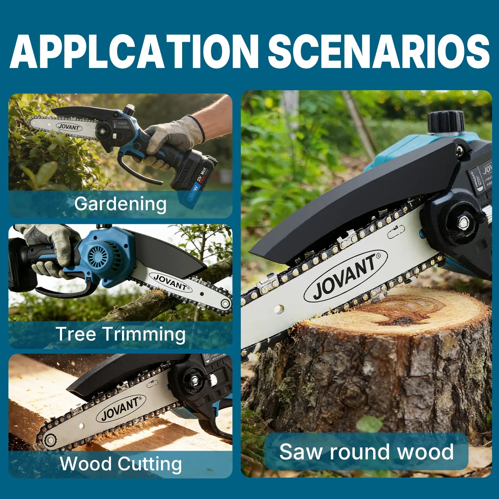 - Lightweight & Secure Design: Weighing only 1.8 lbs, this 6'' Mini cordless chainsaw is lightweight and ergonomically designed for single-handed operation without fatigue, making it easy to use for users of all strength levels, including women and the elderly. For added security, Jovant tree saw features a precision gear lever to prevent chain kickback and a safety lock to avoid accidental startup, making garden work effortless and safe for all family members