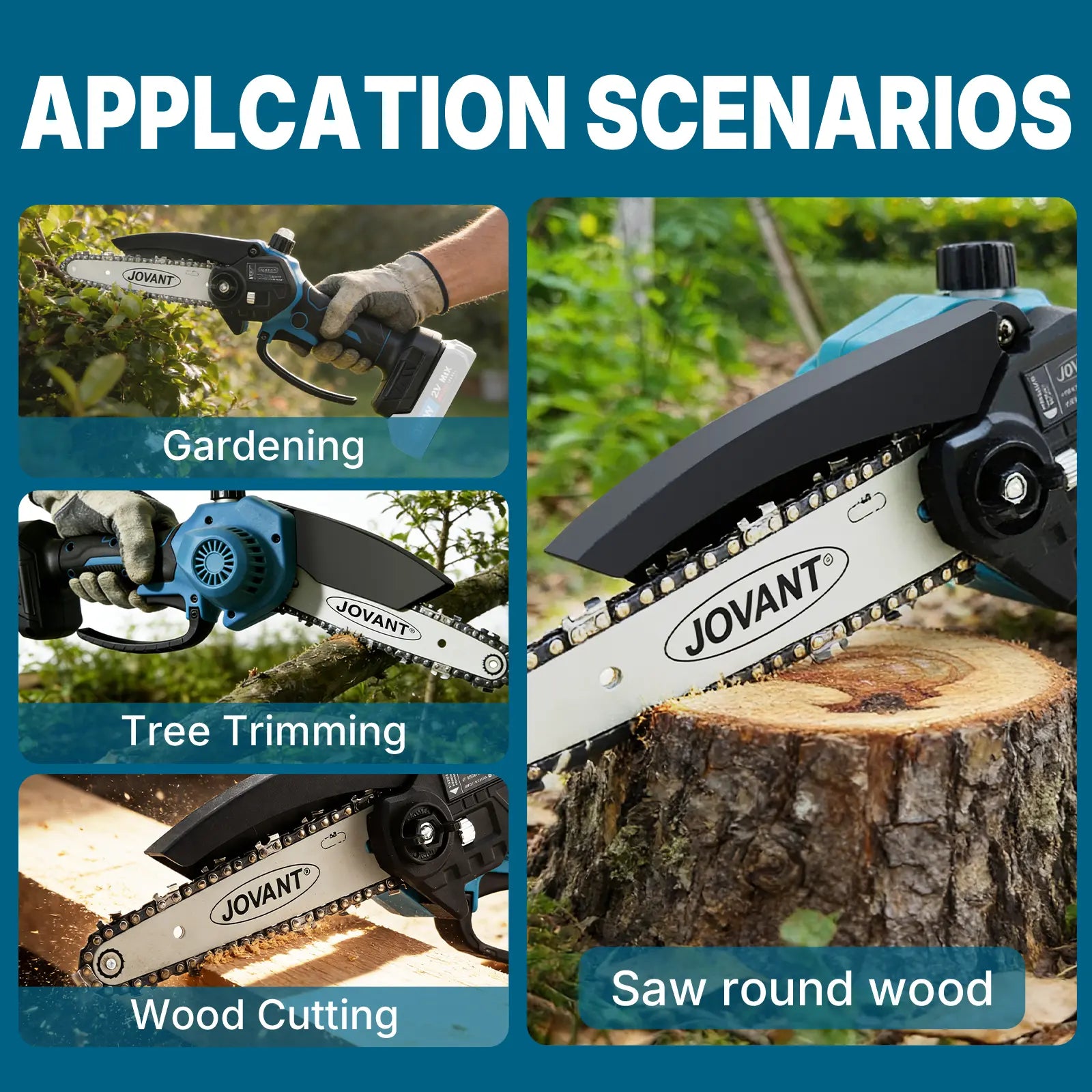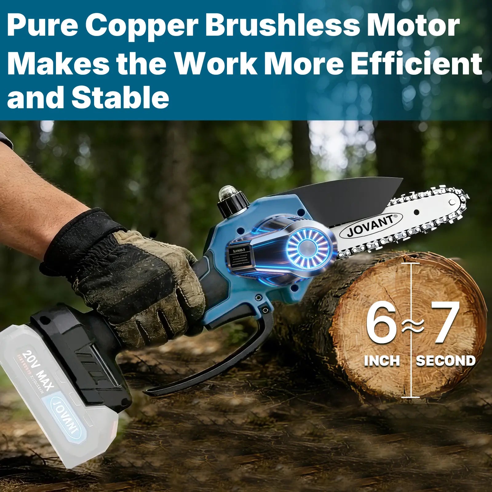 - Efficient Cutting - The Jovant 6 mini chain saw delivers exceptional cutting power with a 21.8 ft/s chain speed, effortlessly slicing through 6-inch logs in just 8 seconds.The small saw 36-tooth precision chain and intelligent torque adjustment system ensure smooth operation for pruning and wood cutting tasks. This cordless electric chainsaw combines professional-grade performance with the convenience of battery-powered operation.